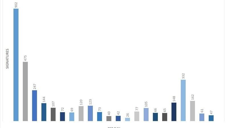 The first day showed it was a popular idea. A lot of collectors hang out on Facebook groups, so posting a notice on a few sites caused the petition to take off. The first three hours it was one signature every 45 seconds and went from zero to 900 in the first day. Then as one would expect, it settled down, but it bumped again on day 8 with the third largest day on day 19. Someone must have passed the link on to an active forum or group.