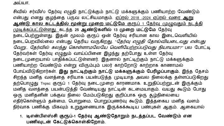1. டிஎன்பிஎஸ்சி குரூப்-1 தேர்வு ஆண்டுதோறும் நடத்தப்பட வேண்டும் என பணிவுடன் கேட்டுக்கொள்கிறோம்.