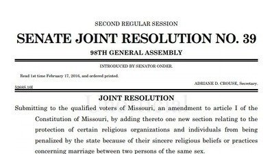 On Tuesday, March 8, 2016, the Missouri State Senate voted to advance Senate Joint Resolution 39 (SJR 39). This bill would place on the statewide ballot a measure to allow individuals, businesses, and religious organizations to refuse service to gay and lesbian couples, based on "a sincere religious belief concerning marriage between persons of the same sex."