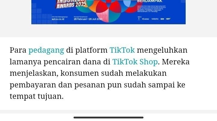 Tokopedia kini telah di beli oleh Tiktok. Banyak hal yang berubah dan mengikuti aturan Tiktok. Penjual Tokopedia harus digabung dengan penjual Tiktok, dan harus menggunakan dashboard Tokopedia Tiktok seller centre. Satu hal yang terasa adalah pencairan saldo penjual. Dulu penjual Tokopedia bisa mencairkan dana hasil penjualan dalam waktu 2x24 jam setelah barang diterima dan ada hitungan waktu mundur nya. Jika pembeli selesaikan penjualan, maka dana akan langsung masuk saldo Tokopedia penjual. Sekarang pencairan dana hasil penjualan yang di kelola Tiktok mundur menjadi 3,7 dan 15 hari. Itu pun masih di tambah 1 hari dana masuk saldo. Sementara jika pembeli selesaikan pesanan, masih harus menunggu 1x24 jam masuk saldo.