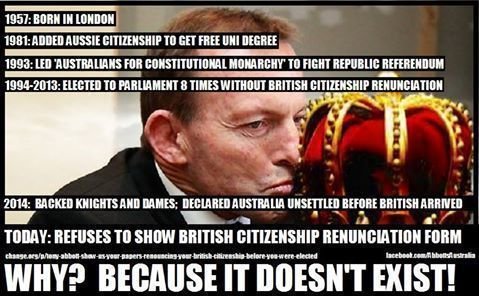 Petition updateShow the public your British Citizenship renunciation form, proving you were not elected to our Parliament illegally.In 2014 we shone the light on Tony Abbott's disregard for our Constitution..