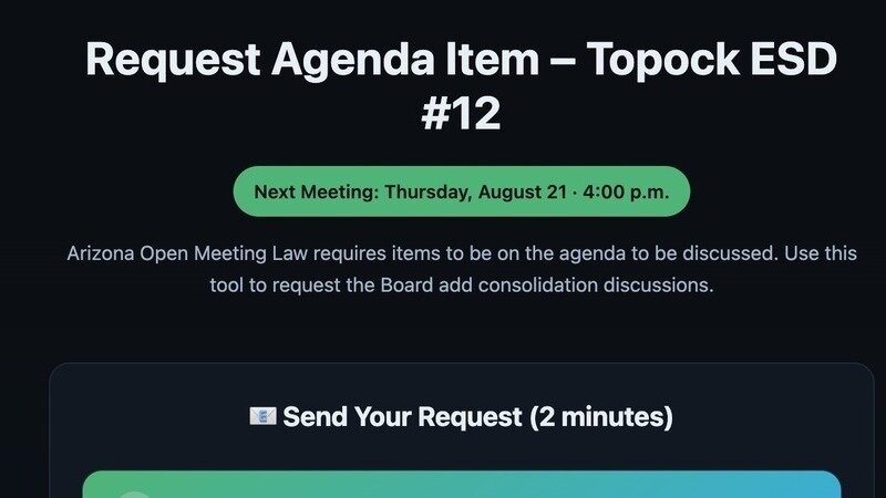 NEW: We've launched a tool that lets every Topock resident request consolidation discussions, or other agenda items be added to the school board agenda: