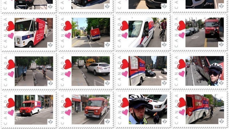 Earlier in the week, following computer programmer George Bell's (@GeorgeBell) example of a single postage stamp, McLarty made an entire sheet of stamps featuring Canada Post vehicles blatantly breaking the law by parking in bike lanes (pictured).
