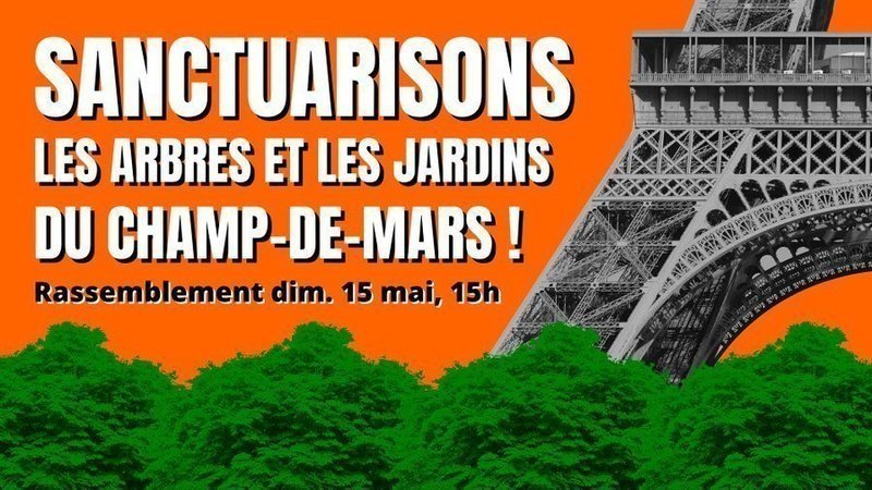 Aussi, forts des 137 500 signataires de notre pétition et rejoints par de nombreuses associations et Parisiens, nous organisons avec les associations signataires de la lettre ouverte à Anne Hidalgo, France Nature Environnement Paris, Groupe National de Surveillance des Arbres, Les Amis du Champ de Mars, Sites & Monuments, SOS Paris, ARBRES, Association Francis Hallé pour la forêt primaire, ce dimanche 15 mai 15h place Jacques Rueff, au pied de la fontaine, un rassemblement pour la préservation des arbres et jardins de la Tour Eiffel.