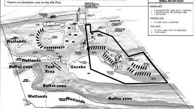 The proposed development consists of 53 cabins —9 existing and 44 new 'mobile' units —that is, 400 square foot structures on wheeled platforms. The new lodging units provide sleeping accommodations and bathrooms, but no kitchens. And the site provides no designated recreation except for a pool. There's no swimming in the lake, and no docks. Lodgers would drive in and out for many meals and activities. The project is essentially a sprawling motel in a location where motels are not allowed.