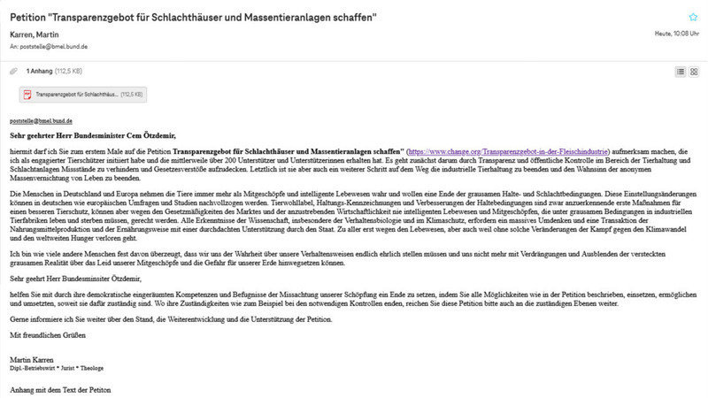 heute habe ich meine erste Mail an Herrn Bundesminister Cem Özdemir als zuständigen Minister für Tierhaltung und Schlachthöfen versendet. Ich hatte angekündigt, dass nach den ersten 100 Unterstützerinnen und Unterstützer ich den Bundesminister auf die Petiton aufmerksam machen werde.