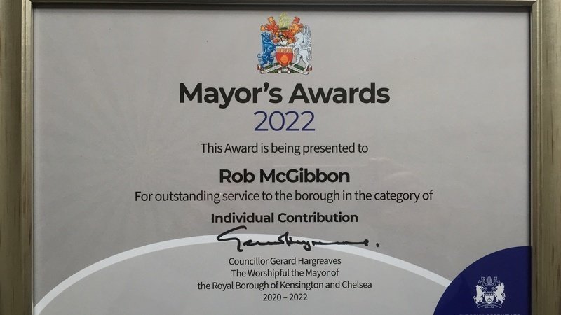 I am pleased to report that last night this campaign was honoured with a 'Mayor's Award' from Gerard Hargreaves, the Mayor of the Royal Borough of Kensington & Chelsea.