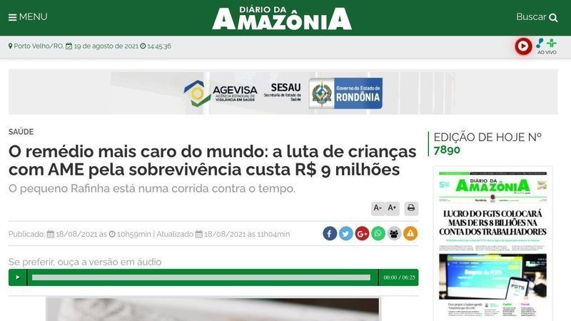 AggiornamentoO bebê Rafinha Melo precisa do medicamento Zolgensma e o tempo é curto!Saiu no Diário da Amazônia! O remédio mais caro do mundo: a luta de crianças com AME