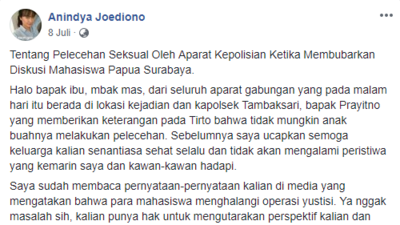 Setelah kejadian tersebut berlangsung, kawan Anin mengunggah kronologi intimidasi, tindak kekerasan, dan pelecehan seksual yang menimpa dirinya ke akun facebook pribadinya. Ia juga menulis beberapa tulisan lain yang juga ia unggah ke akun facebooknya dalam rangka menyuarakan apa yang sebenarnya terjadi serta mencari keadilan atas perlakuan yang telah ia terima.