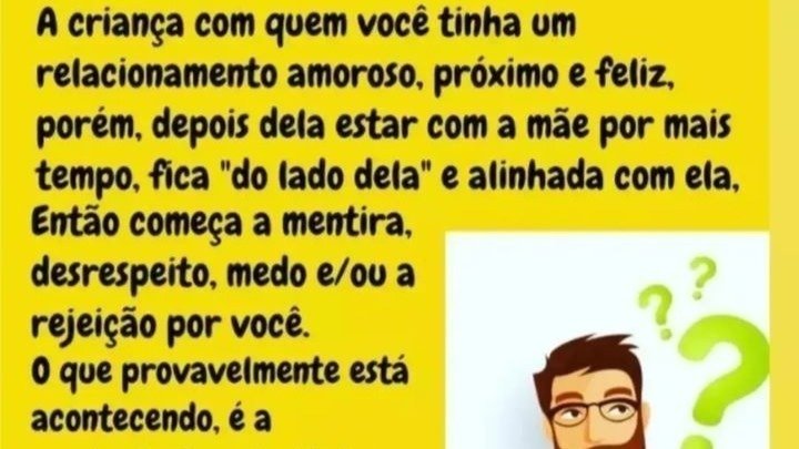 A criança com quem você tinha um relacionamento amoroso, próximo e feliz, porém, depois dela estar com a mãe por mais tempo, fica "do lado dela" e alinhada com ela, Então começa a mentira, desrespeito, medo e/ou a rejeição por você.