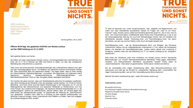 TF wirbt mit Sprüchen wie „Unser Quotenschwarzer“ oder „Abgefüllt und Mitgenommen“ und macht sich über Überlebende sexualisierter Gewalt mit Fragen wie „Hast du ein Penis-Trauma?“ lustig. Nicolas Lecloux selbst kommentierte genanntes Sujet mit: „this is how i like my hoes.“ Der Frauennotruf Mainz veröffentlichte letzte Woche eine Pressemitteilung, in der er auf die retraumatisierende Wirkung von true fruits Werbestrategie hinwies. Bei uns meldeten sich Überlebende sexueller Gewalt, Psycholog_innen und Psychotherapeut_innen, die davon berichteten, wie sehr sie und ihre Patient_innen durch die Sujets belastet sind.
