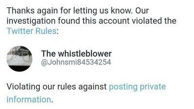 They've got an acknowledgement from Twitter stating that the handle: @Johnsmi84534254 had indeed broken their Twitter Rules on "private information"