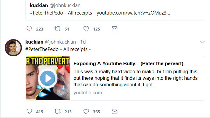 John Kuckian is a Youtuber with hundreds of thousands of subscribers. He also has over 30k Twitter followers. John has consistently made attempts to ruin careers and lives. He uses bully tactics and outright slander. Twitter and Youtube have a responsibility to it's users to keep such people from it's domain. Twitter has banned others for the same tactics. It is expected that one will face some form of bullying or another online at some point in their life. However, that does not mean it should be accepted or tolerated. John has now gone too far and must be stopped and pay the consequences for his actions. John uploaded a video on YouTube calling Peter Monn a pedophile amongst other nasty and unnacceptable things. He also used twitter to promote said YouTube content and further used Twitter to direct hate and slander towards Peter Monn. John Kuckian is by definition a bully.