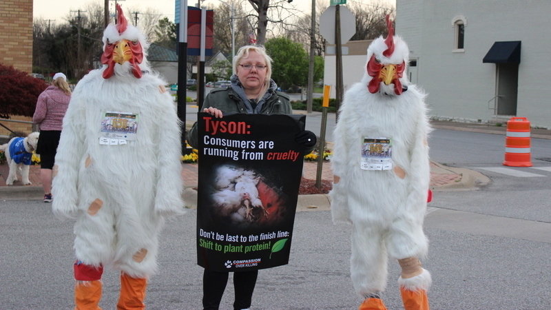 As the annual half marathon kicked off in Tyson’s hometown, two costumed, “injured chickens” limped in the street to represent the hundreds of millions of birds languishing for the company’s products each year. Compassion Over Killing’s 2017 investigation exposed egregious abuse of and the devastating effects of rapid growth on birds in Tyson’s supply chain. Tyson’s birds are bred to grow so unnaturally large, so quickly that they can suffer heart attacks and their fragile legs often collapse under their own morbidly obese bodies -- all before they’re even two months old!