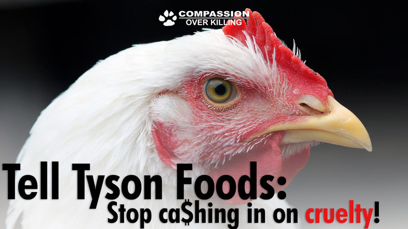 TODAY: Tell Tyson Foods to stop cashing in on cruelty--and boost its bottom line with compassionate plant protein! Leave a polite comment for the poultry giant at http://bit.ly/ContactTyson (see our sample below). Millions of consumers are flocking from cruelty and toward kinder, more sustainable plant protein. And just this week, the nation’s largest poultry producer, Tyson Foods, reported earnings that fell short of analyst expectations. Since Compassion Over Killing’s gut-wrenching investigation exposed egregious abuse and the devastating effects of rapid growth of birds in Tyson’s supply chain, the poultry giant has taken some promising steps: increasing investment in cruelty-free plant protein maker Beyond Meat and creating its own upcoming line of plant-based bowls. In its recent sustainability report, the poultry producer explained, “Consumers are demanding more alternative proteins, making our decision to expand into non-meat products an easy one.” Tyson also claimed in that same report, “Quality care of the animals in our supply chain is a top priority to ensure we offer consumers the most humanely raised food possible” -- yet it has failed to address a major source of suffering in the hundreds of millions of birds it breeds every year: These birds have been bred to grow so unnaturally large, so quickly that they can suffer heart attacks and their fragile legs often collapse under their own morbidly obese bodies -- all before they’re even 2 months old! Today, join us in telling Tyson Foods to become a true food leader by ending rapid growth and continuing to move toward the real future of food: vegan protein. Simply submit the quick form at http://bit.ly/ContactTyson using our sample below or your own polite message: SAMPLE MESSAGE: “As a concerned consumer, I urge you to stop cashing in on cruelty: Please end crippling rapid growth in birds and transition to plant protein! A recent Compassion Over Killing investigation exposed horrific suffering due to Tyson’s breeding of birds to grow so unnaturally large, so quickly that their fragile legs often collapse under their own morbidly obese bodies. Millions of consumers are flocking from this cruelty -- and toward kinder, sustainable plant protein. If Tyson truly wishes to shape the future of food, it would end crippling rapid growth once and for all--and continue shifting toward vegan protein! Thank you.” Please email campaigns@cok.net with any response you get from the company, and don’t forget to keep sharing our petition (http://bit.ly/TysonExposedAgain) on social media. Thank you for speaking up for birds!