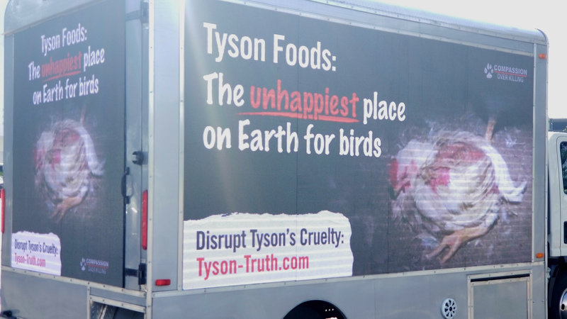 Compassion Over Killing’s mobile billboard is circling the massive poultry industry event all day Monday with a haunting image from our 2017 investigation exposing egregious abuse and the devastating effects of rapid growth in birds in Tyson’s supply chain--along with the text: “Tyson Foods: The unhappiest place on Earth for birds.”
