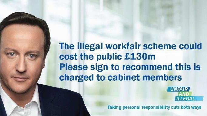 Demand that recompense for the illegal requirement for the unemployed to take unpaid jobs comes from cabinet member pockets rather than the taxpayer