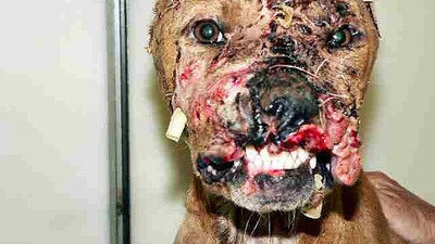 Restrained by a logging chain hooked to a car axle buried in the ground, the pit bull's only shelter from cold, heat and rain likely was a blue 50-gallon plastic barrel. At 46 pounds, he was described as severely underweight. If his days were spent as those of most fighting dogs, he spent hours each week on a treadmill to build his endurance. At other times, he would have been tethered within several feet of another dog to create aggression.
