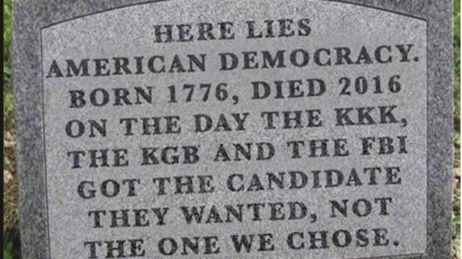 The KGB, Crooked FBI, the KKK and Corruption, as of 2016 America was taken over by a Rich and Wealthy Narcissist Man that was very thin skinned and immediately blew his top if he was not agreed with, He promised positions to, foreign countries, Paul Ryan and a lot of his cabinet picks if he was chosen as president!! and it worked because he had the money to back his words, one foreign country China did not fall for it and as soon as he can we will be at war with them because he said no to a Narcissistic fool..........They got their candidate they wanted and will pay the price as we the American people did not get the one we chose and will pay the price for a Corrupt Government, We will lose brothers, sisters,uncles, cousins and a lot of family members for this thin skinned man that the people never chose while the people that did choose him sit high up in the senate or in another Country while they laugh at how easy it was to take our Country!!!!