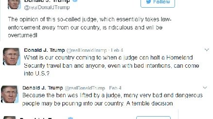 please try to understand, that our judicial system was designed to protect the rights of our citizens. Where Congress and the president fail, our judges step in. And when you publicly undermine them, you threaten one of the most fundamental of American principles. Rather than lash out – on Twitter, for God’s sake – then maybe spend a little more than one hour designing, writing, and implementing your ban. The courts say it is unlawful, then by God, put on your big-boy underoos and act like a grown up.