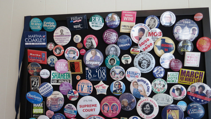 You stand with giants who came before us, each of whom advanced women's rights in the USA, giants such as Alice Paul, Eleanor Roosevelt and the many others whose names and/or dreams are illustrated on these buttons which hang in the office of the Barbara Lee Foundation, a foundation dedicated to electing women to political offices, especially to the U.S. Senate and state governorships.