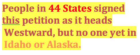 1,285 people in 44 states and in Wash., DC have joined you as signees of this petition. Can you help increase that total? No one in Alaska or Idaho has signed yet. Do you know anyone in Idaho or Alaska? If so, could you please forward this invitation to sign to that person/people?