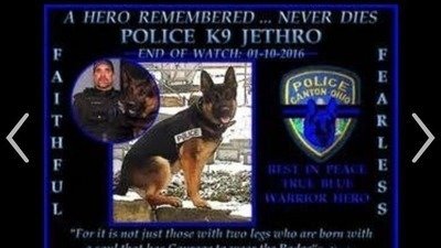 occurred in Canton, Ohio on January 9, 2016. K9 Officer Jethro was killed by a criminal and the consequences for that criminal should be the same as for a criminal who kills a police officer. The story made headlines and police as far as New York and Maryland came to Jethro's funeral.