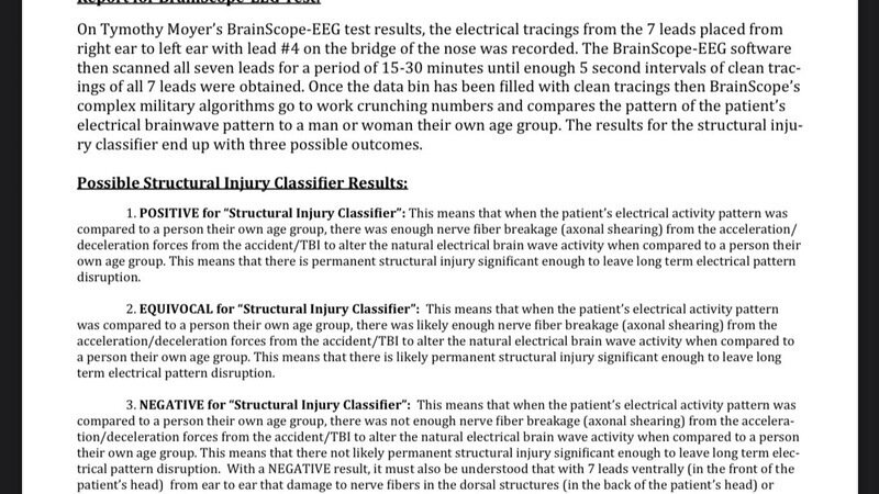The scan can determine: “If a head injury patient has ongoing deficits and symptoms months into their recovery, then there is concern that there may be enough axonal shearing or permanent nerve fiber breakage caused by the acceleration/deceleration forces of the head injury. So when there is concern for structural brain injury that could be permanent an additional technology is necessary to objectively determine this injury. In order to obtain objective evidence to confirm potential permanent structural injury a military grade, FDA approved EEG called BrainScope-1 can objectively determine permanent injury.”- Medical Report from MAC