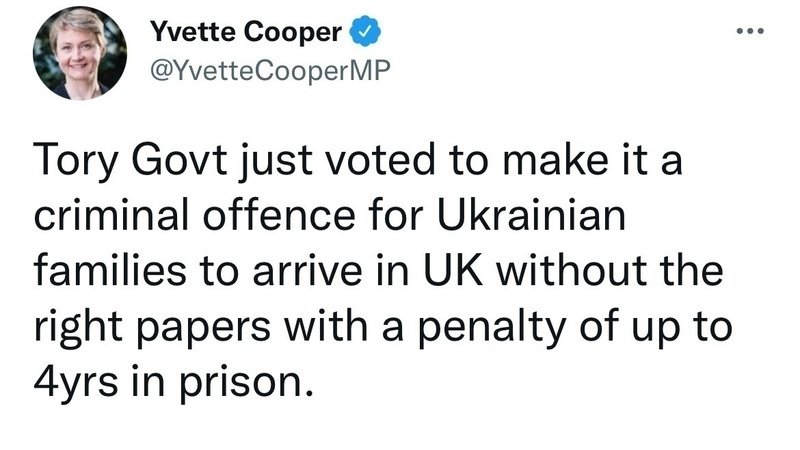 Government have just voted to punish Ukrainians without correct papers seeking asylum here. This would apply to all refugees globally too. Awful.