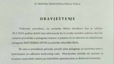 Već od prvog polugodišta četvrtih razreda 2023./2024. godine generacije maturanata, odluke oko eksterne mature i maturskih radova srednjih škola Tuzlanskog kantona su bile stavljane pod upitnik. Situacija nikad nije bila jasno razjašnjenja, i tek na kraju prvog polugodišta 2023. godine su zvanično objavili da se eksterna matura ne ukida, ostavljajući tri predhodna mjeseca učenicima beskorisnim i protraćenim u vjerovanju da se neće održati.