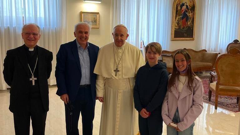 Through the design of the glass we see him coming. He opened the door, and it was like a meeting between friends. Our eyes met, we shook hands, and Archbishop Zani invited me to speak: "Holy Father, thank you for all you are doing to stop this latest, horrible war. Thank you." The Pope's response, which I keep in my heart, contained all the harshness of the clash taking place on a global level and the serene solidity of the successor of St. Peter.