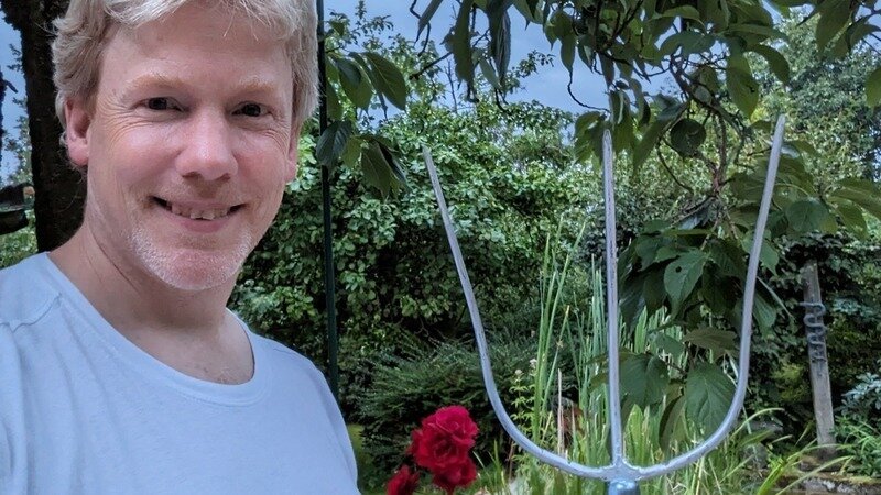 Auf dem Foto sehen Sie mich mit einer von 1648 eingetauschten Friedensforken des Künstlers Volker-Johannes Trieb. Sie wird ganz normal "in den Betrieb gehen", wenn das hohe Gras der Wiese getrocknet ist, werde ich das Heu mit der Friedensforke einholen - friedliche Verwendung.