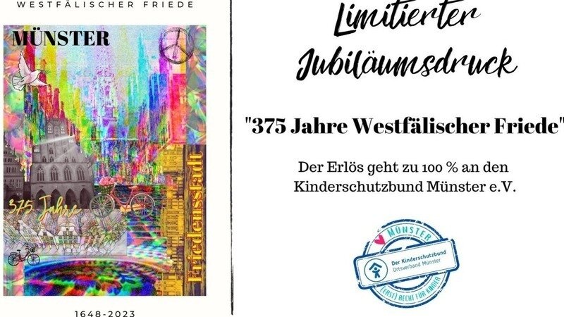 der Kinderschutzbund Münster hat anlässlich des Jubiläumsjahres "375 Jahre Westfälischer Frieden" eine Münstercollage im Angebot.