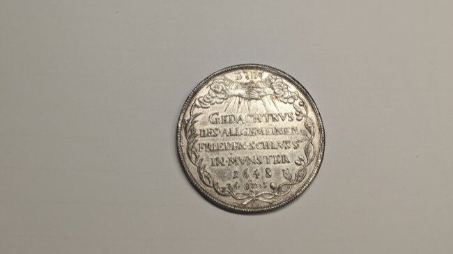 hier nun die Rückseite einer Friedensmedaille aus dem Jahre 1648 von Engelbert Ketteler. Der Titel lautet::