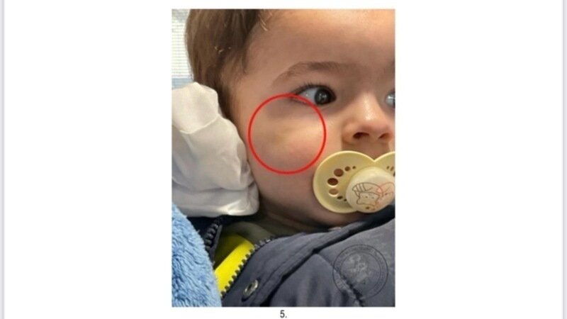 Je constate que l'enfant à un bleu sur la joue, juste en dessous de l'œil gauche…