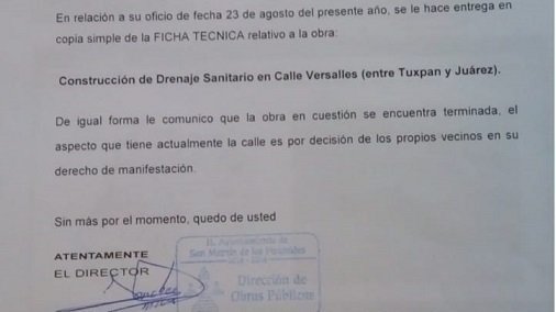 Por oficio de 31 de agosto de 2018, el Director de Obras Públicas de San Martín de las Pirámides, Estado de México, informó a un solicitante de documentación que la obra se encuentra inconclusa debido a las manifestaciones de los vecinos afectados.