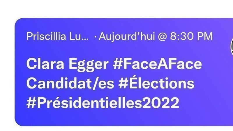 Concernant le point 3 : je commence un cycle de TWITTER SPACE (un peu comme une radio libre/antenne libre mais sur Twitter) où je propose aux candidates et candidats de présenter leur programme et de répondre aux questions des auditeurs. Je commence ce soir avec Clara Egger, qui se présente pour ESPOIR RIC.