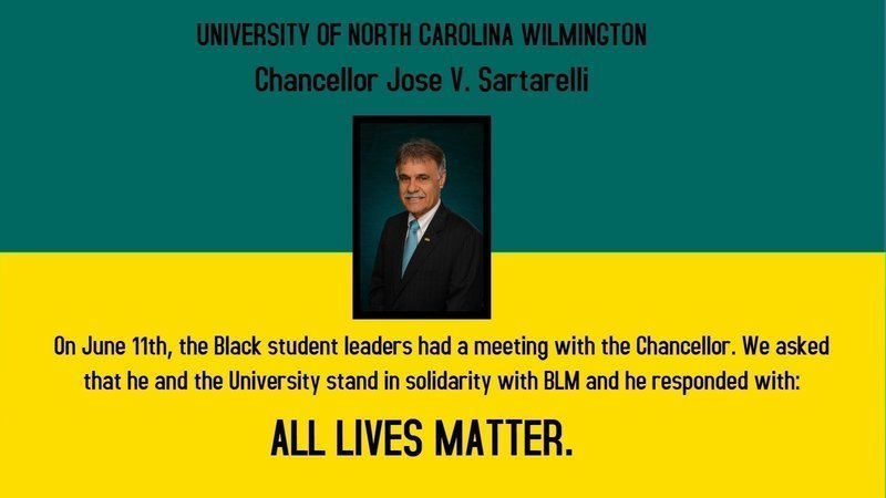 On June 11th, the Black student leaders had a meeting with Chancellor Sartarelli. This meeting was to discuss how to improve the lives and experience of Black students and how to move forward as a united community. We asked him (and the University) to stand in solidarity with the Black Lives Matter Movement. In response, he stated "If you are asking me tomorrow to start painting and decorating the University with BLACK LIVES MATTER, that’s going to be very difficult because I believe ALL LIVES MATTER."