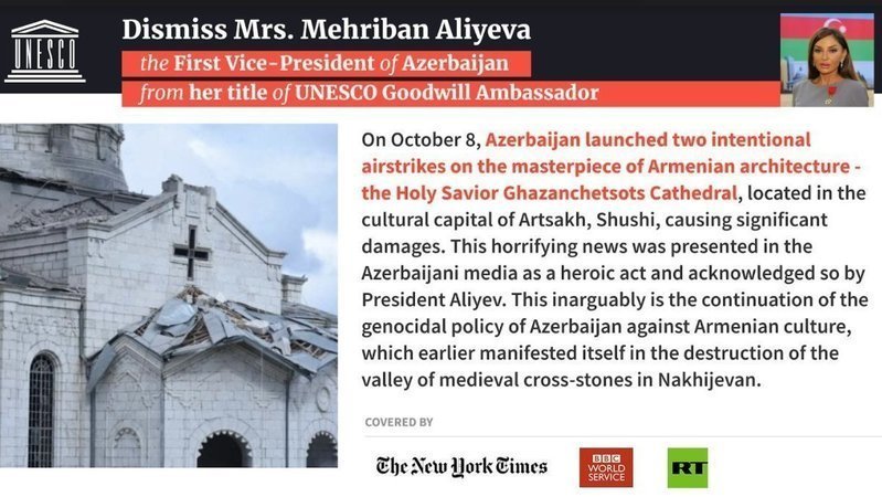 On October 8, Azerbaijan launched two intentional airstrikes on the masterpiece of Armenian architecture - the Holy Savior Ghazanchetsots Cathedral, located in the cultural capital of Artsakh, Shushi, causing significant damages. This horrifying news was presented in the Azerbaijani media as a heroic act and acknowledged so by President Aliyev.