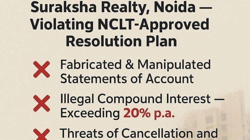 Suraksha Realty continues to fabricate inflated statements with compound interest — threatening buyers with cancellation or denial of possession.