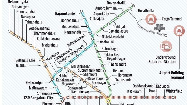 This System is proposed to have mainly 4 Alignments - (1) Kengeri to Whitefiled - via KSR Bluru City Rly Stn ; (2) Bluru City to Rajanakunte - via Yelahanka Rly Stn ; (3) Nelamangala to Byappanahalli - via Yeshwantpura & Hebbal Rly Stn ; (4) Heelalige to Devanahalli - via Byappanahalli & Yelahanka Rly Stn.