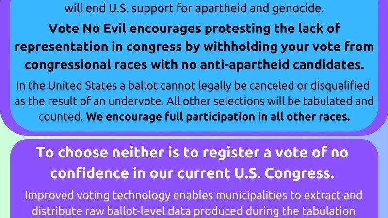 Check out and share our endorsements for president and vice president, and learn how choosing neither can register your protest vote of no confidence in congress (if anti-apartheid congressional candidates are not available).