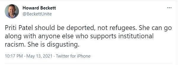 As Unite members, we are appalled that Howard Beckett has engaged in racist behaviour on social media. Howard Beckett said that Priti Patel, a very high profile British woman of Asian decent, should be deported. While we are angry at this government's immigration policy no one should be deported because of their views. Priti Patel is a British born woman. Black and brown British people live with this kind of language every day and should not be subject to this kind of abuse anywhere, least of all from people wanting to lead a major trade union.