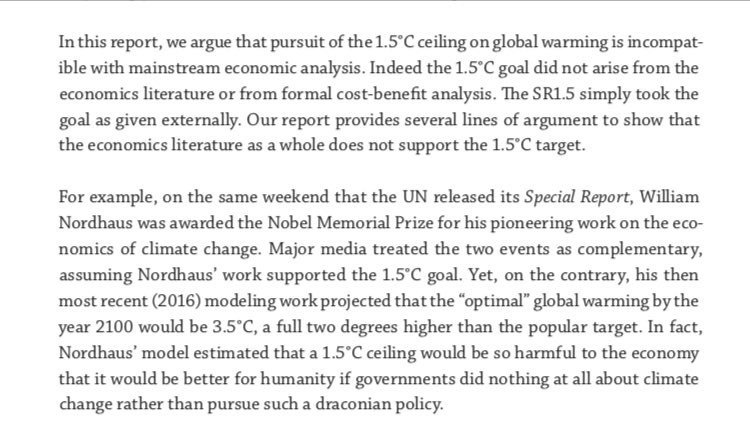 "For example, William Nordhaus argues that a much more lenient target of 3.5°C would be optimal, and indeed that the 1.5°C target is so costly that it would be better for governments to do nothing at all rather than enforce such a draconian limit."