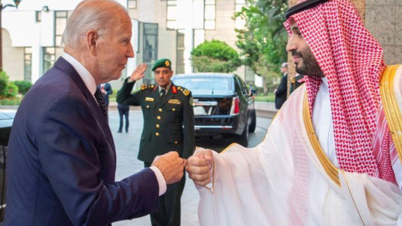 Saudi Crown Prince Mohammed bin Salman fist bumps U.S. President Joe Biden upon his arrival at Al Salman Palace, in Jeddah, Saudi Arabia, July 15, 2022.
