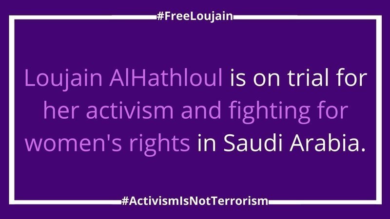 Loujain AlHathloul is on trial in Saudi Arabia at the Specialised Criminal (terrorism) court for her activism. Loujain has been in pre-trial detention for nearly three years and during that time has been tortured (to include) electrocuted, waterboarded and sexually assaulted. The absurd charges against her include: Applying for a job at the United Nations, calling for the end of the oppressive male guardianship system, contacting international organisations (Amnesty International and Human Rights Watch), speaking about her detention and supporting Saudi human rights movements.