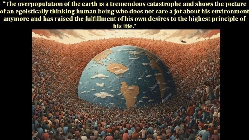 "The overpopulation of the earth is a tremendous catastrophe and shows the picture of an egoistically thinking human being who does not care a jot about his environment anymore and has raised the fulfillment of his own desires to the highest principle of his life. The quality of the future life of all people is inseparably connected with the state of nature. The unrestrained plundering, exploitation and the accompanying destruction, devastation and poisoning of the earth, the air and the water, triggered by the enormous demand for food and goods of all kinds of a still explosively growing population, confronts people with unsolvable problems. Overpopulation is not a dirty word, but the exact name for a number of people that can no longer be coped with by nature, caused by senseless and irresponsible childbearing. In each country only so many people should live, as this can also nourish from own strength. In addition, fauna and flora must have enough space to develop in order to fulfill their vital functions in a well-functioning ecosystem. From this it becomes obvious that, so to speak, all countries on earth are overpopulated and would have to do something about it. The containment of overpopulation does not mean that any people have to go away and has also nothing to do with racism, but it demands from the human being, no matter which skin color, that with all strength a reasonable birth control must be striven for and carried out, for the benefit of all humans and all life on our planet."