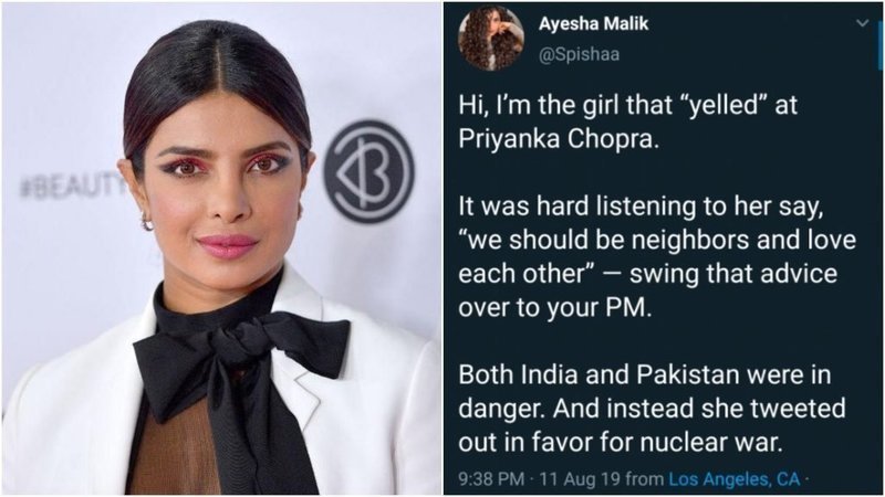 Actress Priyanka Chopra is encouraging nuclear war. She has no role in decreasing tensions between Pakistan and India. Like her country (India) she is also an Aggressor and hypcrite. Such person should not be a part of world organizations helping for the peace among the Nations. We demand her immediate removal from UN.