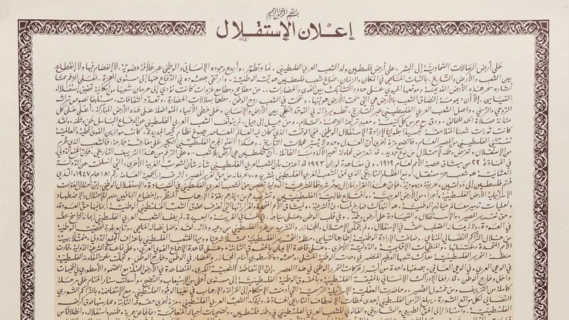 The Palestinian Declaration of Independence formally established the State of Palestine, and was written by Palestinian poet Mahmoud Darwish and proclaimed by Yasser Arafat on 15 November 1988 (5 Rabiʽ al-Thani 1409) in Algiers, Algeria.