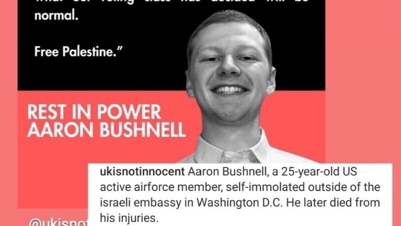 Active serviceman Aaron BUSHNELL self immolated outside israeli embassy in Washington in protest at the genocide by USA Britain and some of the European countries.